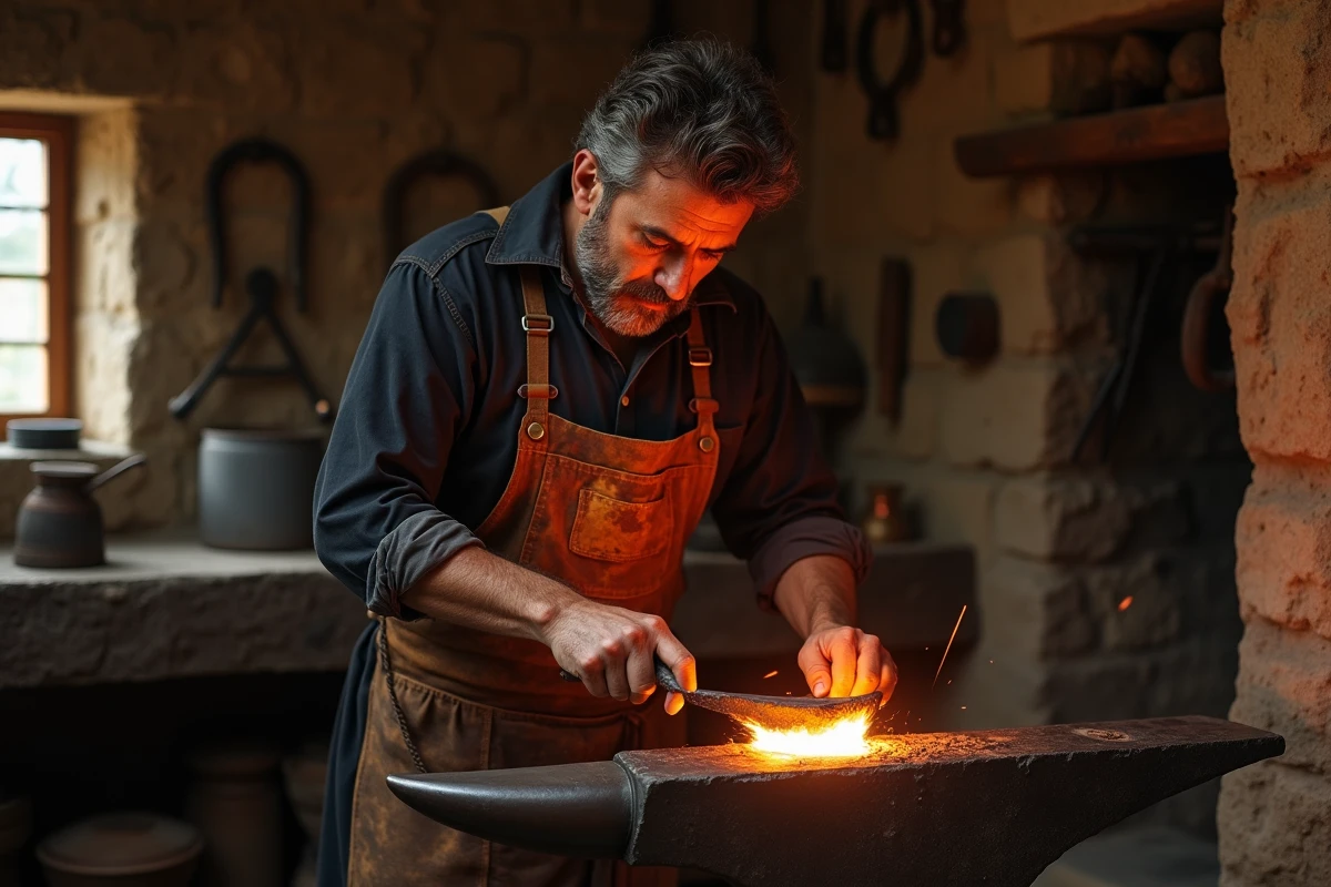 - L’enclume : véritable socle, elle incarne la solidité, la constance, le point d’appui où la matière brute commence sa métamorphose. C’est le lieu de la résistance, capable d’absorber les coups sans broncher.